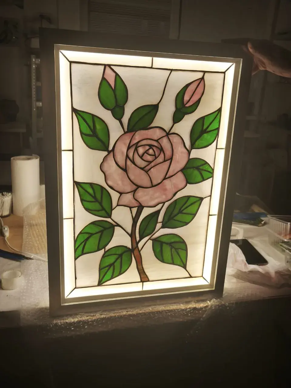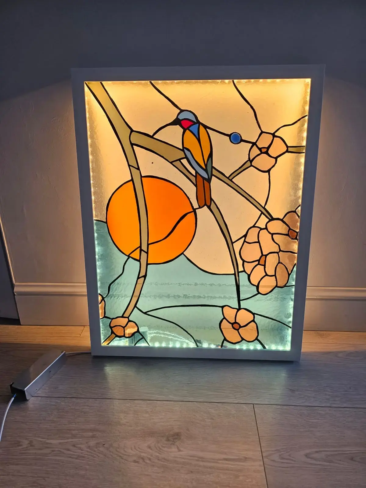 Каждое изделие выполняется вручную из витражного стекла. Стекло может быть как прозрачным, так и полупрозрачным Размер и форма задаются индивидуально под ваш запрос. По запросу можем сделать подсветку под ваше панно, превратив его в настенный витражный светильник.